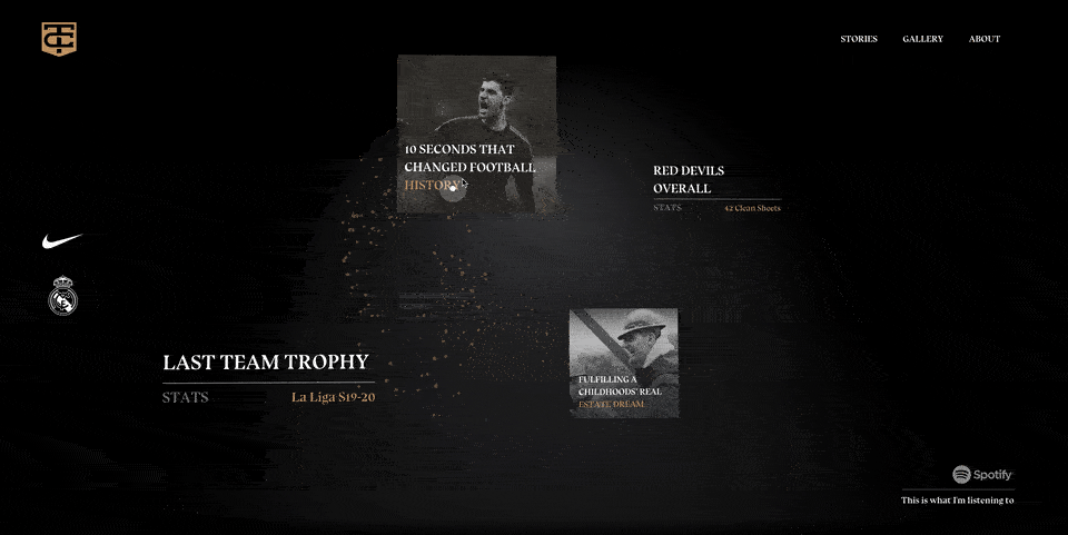 Taking the users into account as a mostly younger male audience I found inspiration in game like design. With that the idea of a 3D space for the home page emerged. The user is able to move front to back through the space, encountering the content of the site on their journey. The overall experience had to embody the spacious and game like design approach which was technically achieved by Three Sixty Media.